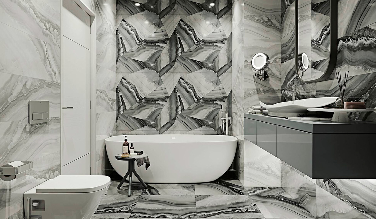 Ванна Intercerama Varadero — це стильні та практичні рішення в галузі дизайну. З загального вигляду кімнати одразу виділяється неординарний малюнок керамограніту Intercerama Varadero 72052 Rec 60*60 см темно-синього кольору. Використання даного дизайну підходить лише тим, хто не боїться сміливих рішень. Надати спокійний тон кімнаті допоможе плитка для стін Intercerama Varadero 239071 30*90 см світло-сіра 2 сорту. Вона нейтралізує яскравий акцент керамограніту, допоможе втілити усі дизайнерські ідеї в життя.