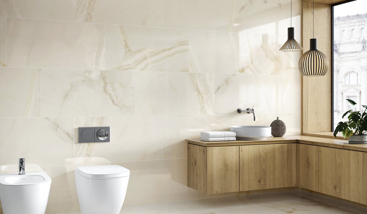 Уявіть сучасну ванну кімнату, що ідеально вписується в концепцію древнього міста. Естетика і надійність новітніх матеріалів не суперечать вічній красі каменю, традиційній гармонії дерев’яних елементів та досконалості простих форм. Такою вишуканою та стриманою водночас є ванна кімната, оздоблена глянцевим керамогранітом Megagres Reek Grey GFJ00260120H 60*120 см бежевого кольору, що демонструє природну чарівність мармуру, його чудернацькі лінії, переливи та відтінки. Натуральні барви та міцність дерева поєдналися в елегантній поверхні меблів та віконної рами. На такому гармонійному та м’якому фоні особливо елегантно виглядає білосніжна кераміка біде підвісного Koller Pool Round Smart RN-0495-B, унітаза підлогового Creavit Mare Rim-Off без обідка та умивальника Jaquar Opal OPS-WHT-15901N 48 см. Мінімалізм змішувача для умивальника Invena Glamour BP-02-U01-V та кнопки для змиву лише підкреслює витонченість деталей в загальній композиції інтер'єру. Стильні лампи, м’які рушники, охайний вазон та атмосферний декор — наче завершальні мазки талановитого майстра, що створює вічні шедеври.