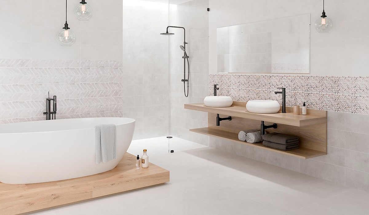 Ванна Opoczno Debora — це вишуканий мінімалістичний дизайн, що з допомогою самої лише колірної палітри передає атмосферу затишку, чистоти та гармонії. Вдале поєднання плитки для стін Opoczno Debora satin 20*60 см сірого кольору, білої плитки для стін Opoczno Debora satin 20*60 см і делікатного візерунку сірої плитки для стін Opoczno Debora print satin 20*60 см візуально збільшує простір, а стильна імітація натуральної деревини керамограніту Allore Group Rovere Ivory F PR R Mat 1 15*90 см кольору айворі ідеально доповнює загальний фон. Саме в такому інтер’єрі почуваєш себе, немов володар світу, що досягнув вершин і насолоджується кожним моментом свого розкішного життя. Навіть найменші деталі, такі як змішувач для умивальника KFA Armatura Neda black 5822-612-81, підкреслюють статусність свого власника.