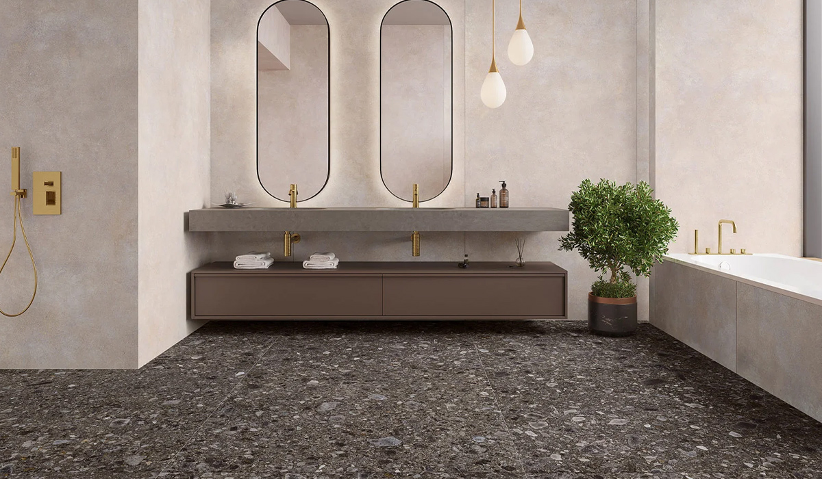Ванна кімната – це місце, де починаємо день і закінчуємо його, тому так важливо, щоб інтер’єр наповнював силою вранці та дарував спокій та відпочинок ввечері. Темна підлога, оздоблена керамогранітом TEO Ceramics Terra Greige F PC Sugar Rec 60*60 см сірого кольору, дарує енергію землі та глибину елегантних відтінків. М’якість та стриманість ошатних стін забезпечує матова поверхня керамограніту Opoczno Harmony Stone Cream matt Rec 59,8*119,8 см сіруватого відтінку. Два овальних дзеркала Wellss mirrors Eleganza Solito S з підсвіткою 110*60 см поєднують естетику і функціональність. Привабливий блиск змішувачів для умивальника Laveo Pola BAP_G22D золочених та сифонів для умивальника KFA Armatura 600-003-31 створюють яскраві акценти та додають приміщенню шарму і розкоші. Ванна пряма акрилова Riva Medea 150*70 см розміщена біля вікна, що дозволяє поєднувати процедури релаксу із приємним спогляданням пейзажу. Декоративний вазон ідеально доповнює стиль ванної кімнати, даруючи свіжість та енергію природи.
