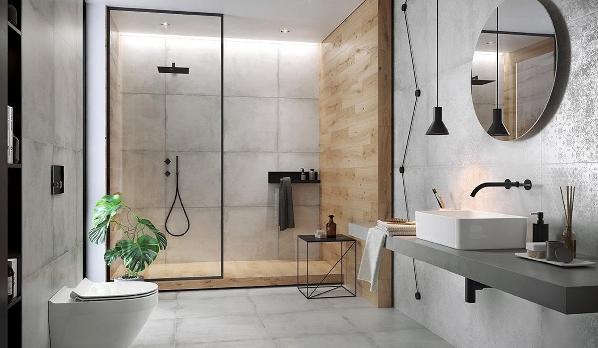 Перед вами ультрасучасна ванна кімната, в якій кожна деталь відображає смак і стиль її власника. Почнемо з акцентної стіни, яка вражає своєю вишуканістю та оригінальністю. Керамограніт Opoczno Stormy Grey Carpet Rec, зі своїми візерунками, створює ефектну фокусну точку приміщення, додаючи індивідуальності. Підлога й інші стіни кімнати вкриті керамогранітом Opoczno Stormy Grey Matt Rec, що складає гармонійний фон, доповнюючи загальний стиль. Сірий колір плитки надає приміщенню відчуття сучасності. Умивальник, розташований на підвісній стільниці, оснащений стильним чорним сифоном McAlpine 120, який гарно поєднується зі стилістикою при цьому не виділяючись. Над раковиною прикріплено кругле дзеркало Studio Glass MARTEL з сенсорним вимикачем, яке візуально розширяє простір. Унітаз консольний Cerastyle City з функцією біде та сидінням SoftClose розміщений навпроти, формує баланс в інтер'єрі та забезпечує зручність користування. В душовому просторі знаходиться чорна полиця для ванни AWD, яка створює контраст з плиткою. Над кабіною вмонтовані світильники точкового типу Feron 8060-2 MR16 з LED підсвічуванням, що надають додаткового освітлення під час гігієнічних процедур.