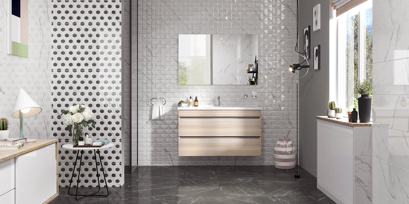 Колекція керамічної плитки для ванної кімнати від турецького виробника сподобається цінителям мармурових поверхонь з характерними для них прожилками та геометричними мотивами. Біла плитка для стін Kale Sempre White RP-7130 25*75 см та керамограніт Paradyz Artstone Black MATT 59,8*59,8 см чорний гарантують гармонійну сумісність як з класичними, так і з сучасними стилями. Плитка для стін Halcon Palatina Tera Blanco mate 30*90 см в точності відтворює такий же візерунок натурального мармуру, але має більш оригінальне та нестандартне вираження, адже нагадує популярну мозаїчну кладку з її особливим ефектом. І ось ви вже однією ногою у себе вдома, а другою ступаєте в наповнену духмяною парою лазню десь у Давньому Римі. На столику кавовому Merx Life ЛФ585 білий/антрацит ви знайдете ароматичні олії та креми, а зовсім поряд в тумбі Aqua Rodos Вінтаж консольна севілья з умивальником Frame 100 см — свіжі рушники та простирадла. Важко вийти сухим з води, коли вас заманює такий витончений простір з продуманим до дрібниць оформленням не лише стін, а й усіх відкритих поверхонь.