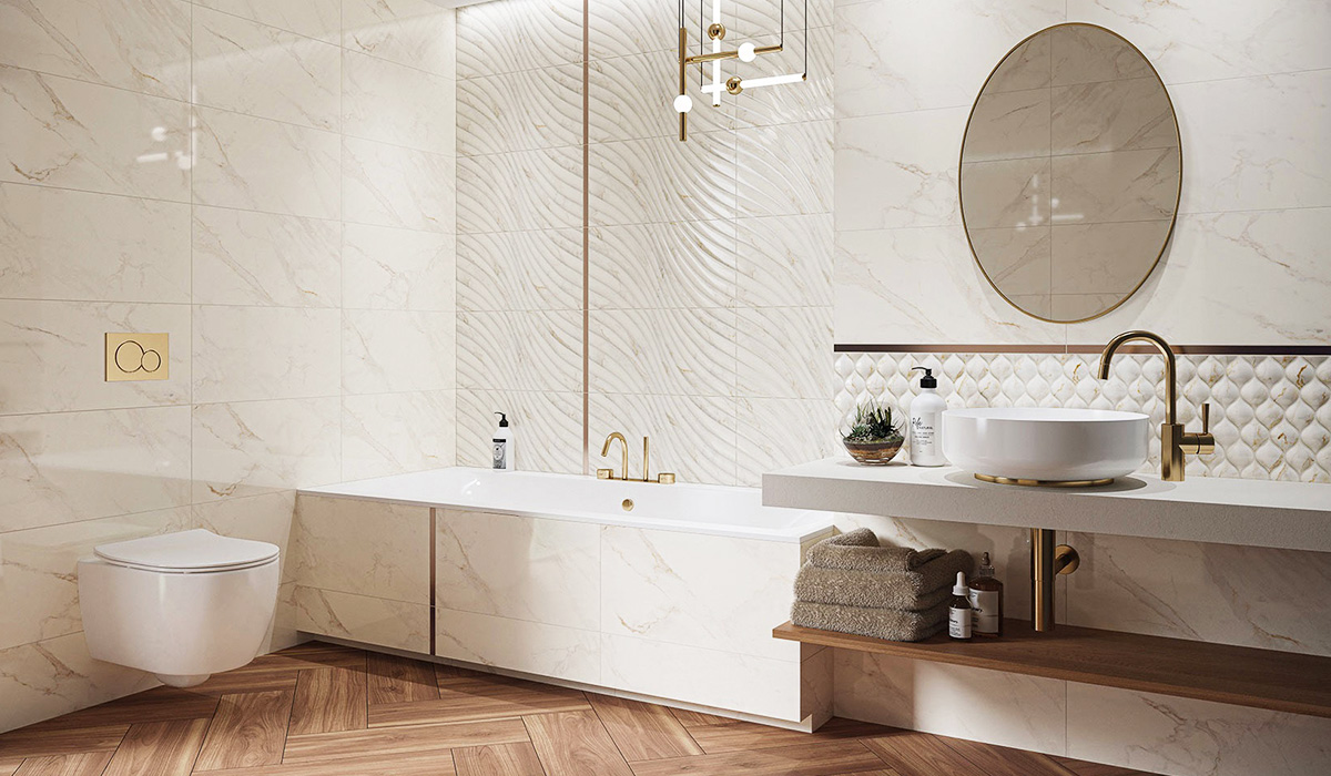 Розкішний інтер'єр цієї ванної кімнати дивує гармонійним поєднанням класичних елементів з сучасними сантехнічними приладами, будуючи комфортну атмосферу для відпочинку та гігієни. Стіни вбиральні повністю оздоблені кремовою плиткою Paradyz Bliss Gold Glossy 30*60 см, яка додає приміщенню світла. Одна акцентна стіна біля ванни вирізняється завдяки текстурній плитці Paradyz Bliss Gold Str Glossy 30*60 см, створюючи ефектний фокус, додавши глибини цій зоні. Світлодіодна стрічка Feron LS607 LED-RL 60 SMD/м 5 м RGB на білому підсвічує її, поглибивши гру світла та тіні. Пряма акрилова ванна Dakota Double Koller Pool 170*75 см додає комфорту та стилю й формує ідеальний куточок для розслаблення. Недалеко розташований унітаз підвісний Geberit Modo 502.827.00.1 Rimfree з сидінням, який має прихований монтаж та є зручним елементом дизайну. Під раковиною можна помітити вишуканий сифон для умивальника KFA Armatura 600-003-31 у золотому кольорі, що створює класичний елегантний ефект. Підлога оздоблена коричневим керамогранітом Cerrad York Brown 17,5*60 см, укладеним ялинкою з малюнком натуральної деревини, надаючи простору теплого природного вигляду. Всі ці аксесуари спільно створюють ванну кімнату, яка вражає своєю естетикою та стає місцем відпочинку та релаксації.