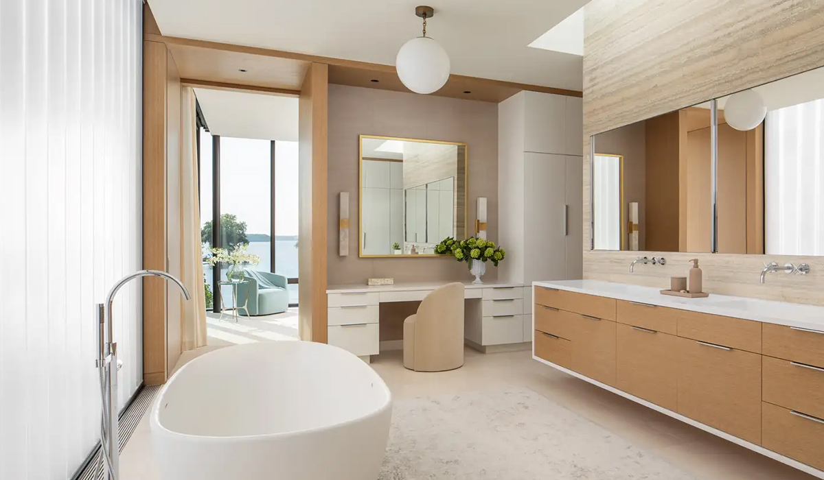 Простора ванна кімната дозволяє зонувати приміщення за різними призначеннями та створювати неповторний інтер’єр, що поєднує елегантний вигляд та досконалу функціональність. Світла підлога, оздоблена керамогранітом Paradyz Sunnydust Light Beige Mat 59,8*59,8 см світло-бежевим, дарує атмосферу легкості та невимушеності разом зі світлими меблями та білою сантехнікою. Стіна оздоблена керамогранітом Intercerama Tuff 02021 120*60 світло-бежевим ефектно поєднується в композицію разом з дзеркалами Studio Glass Buffalo 80*60 см. Макіяжну зону складає туалетний столик, пуф зі спинкою Bonsso Oia Charm off white та просторе дзеркало Ювента Neo Square 70*80 см. Додаткове освітлення темних кутків кімнати створюють світильники точкові Feron DL6130 MR16 G5,3 чорні. Ванна, що стоїть окремо, підкреслює витончену атмосферу кімнати, додаючи просторості та розкоші.
