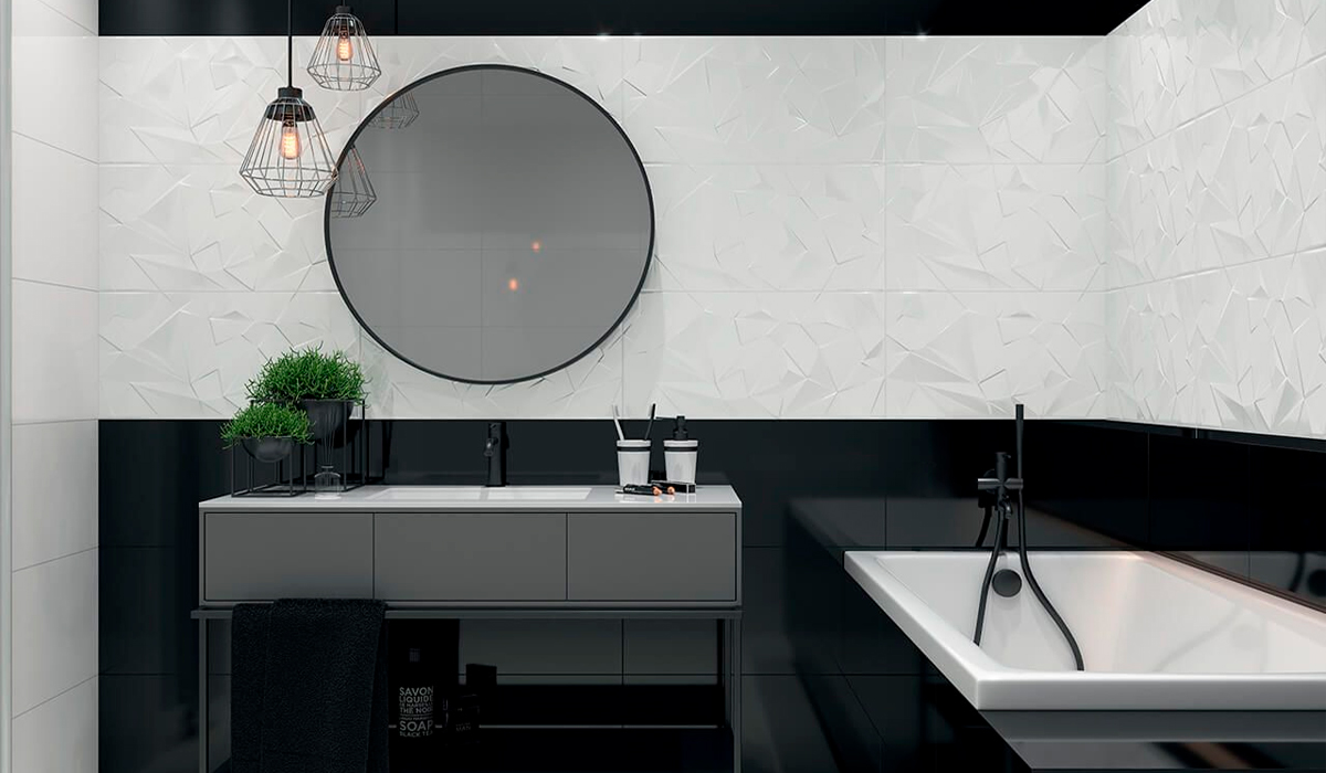 Ванна Paradyz Synergy виділяється елегантністю, адже у ній поєднуються класичні темні та світлі кольори. Виграшну композицію становить рельєфна плитки для стін Paradyz Synergy bianco Str B 30*60 см біла та глазурована плитки для стін Paradyz Synergy bianco 30*60 см біла, що роблять дизайн цікавішим, завдяки поєднанню різних фактур.