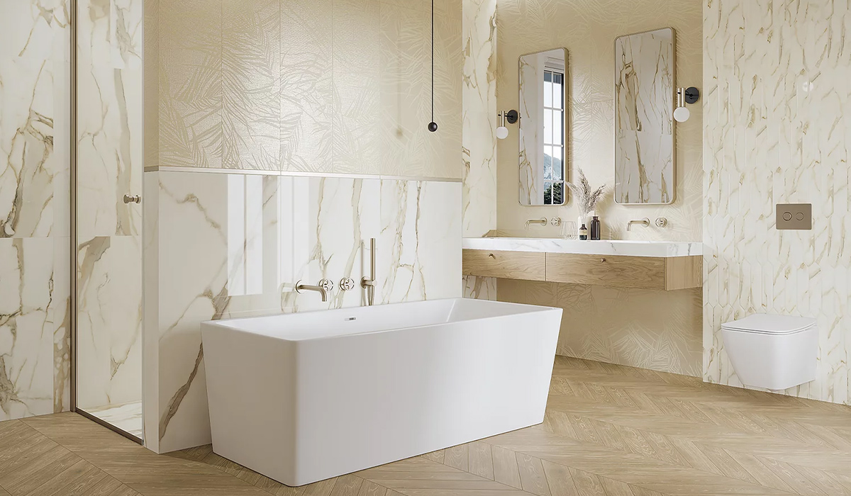 Світла і затишна ванна кімната Paradyz Wildland Warm подарує справжній спокій та релакс після напруженого робочого дня. Ніжні карамельні відтінки стін забезпечить керамограніт Intercerama Calacatta Gold 35071 Rec 120*60 см світло-сірий, що покриває значну частину поверхонь. Підлога продовжує кольорову гаму теплих барв, в її оздобленні використано керамограніт Paradyz Wildland Warm Dekor Chevron Lewy/ Prawy 14,8*88,8 см бежевого кольору. Центральним атрибутом є зручна велика ванна, тоді як душове відділення ховається за вишуканою естетикою стіни та душовими дверима Armaform Elbe 113-09324 90*185 см. Праворуч від зони умивальників та просторих дзеркал розміщений унітаз підвісний Koller Pool Trend TR-0490-RW з сидінням Soft. Рослинні елементи та структура дерева, що зчитується з орнаменту плитки, додають природного затишку та неповторного шарму кімнаті.