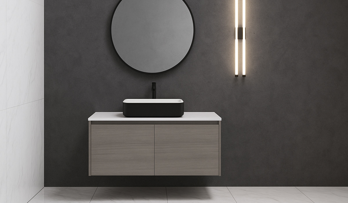 Удаваний аскетизм стилю хай-тек у ванній кімнаті вдало компенсують інновації матеріалів, сантехніки та освітлення. В інтер’єрі цієї кімнати чорно-біле поєднання поверхонь створює збалансований тандем кольору для вишуканої атмосфери та естетики стилю. Фарба гумова універсальна TRIORA 247 RAL 9004 чорна 3,5 кг на стіні виглядає ультрасучасно завдяки футуристичному світильнику, що розділяє монохромність поверхні яскравими чіткими вертикальними лініями. Інша стіна та підлога оздоблені білим керамогранітом Raviraj Silver Statuario Pol 60*60 см та Cerama Market Honey Satario Sugar 60*120 см з глазурованою поверхнею. Ці матеріали збагачують простір красою натурального мармуру, спрощують догляд і прибирання кімнати. Лаконічна підвісна модель тумби бездоганно відповідає вимогам стилю. На ній розміщений екстравагантний умивальник на стільницю Laveo Mogami VUM_7250 50*40 см з ефектним змішувачем Rubineta Ultra-18 U80068N чорним. Кругле дзеркало Studio Glass Ark Royal Black Iron Mirror 70*70 см в чорній металевій оправі поєднує практичність та вишуканий дизайн, що стає виразною ознакою смаку і довершеності інтер’єру.