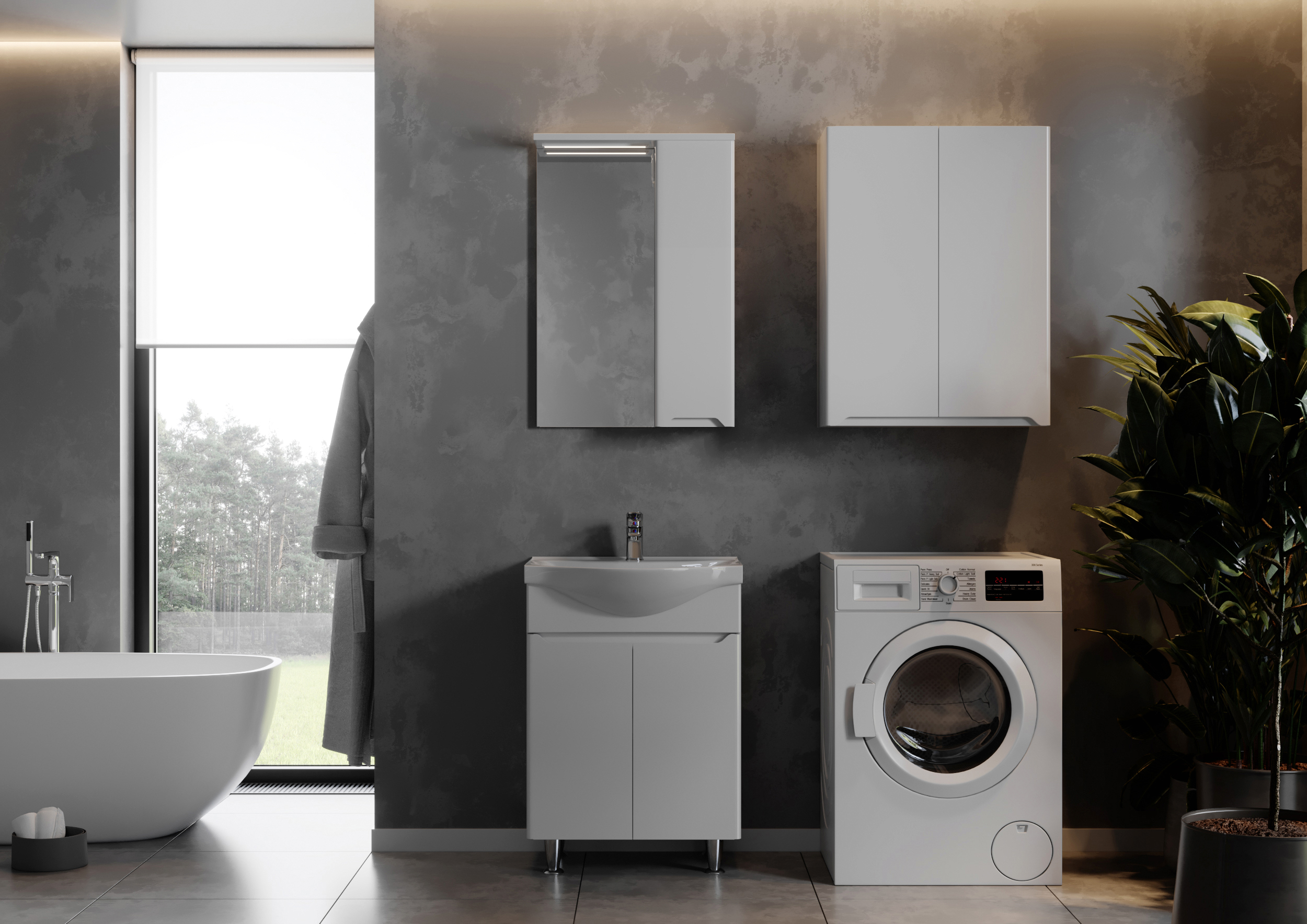Ванна Respect-M Prime — це про стиль, досконалість, естетику, стримані форми та звісно комфорт. Загальний вигляд формує першочергово інтер’єр стін, він задає тональності кімнаті, створює перші емоції від приміщення. Так, керамограніт Атем Damask WM 60*60 см білий візуально не зменшуватиме кімнату, зробить її просторою та затишною. Поєднання тумби Respect-M Prime Pr-55 з умивальником Basic та змішувача для умивальника Ferro Tiga BTG2VL допоможе проводити щоденні ритуали без лишніх клопотів. Вам не доведеться шукати місце для різноманітних засобів гігієни чи інших речей, оскільки все знаходитиметься під руками. Прекрасним варіантом для зберігання побутової хімії, прального порошку чи кондиціонеру є шафа навісна Респект-М Prime Prc-60. Вона містка, якісна, всередині містить три полиці однакової висоти, легко поєднується з меблями навіть інших, суміжних колекцій. Важливим, а також завершальним елементом у ванній кімнаті є дзеркало Респект-М Prime Prmc-55 праве, яке виділяється своїм зручним функціоналом, адже містить шафку для доглядових засобів та спеціальну підсвітку, яка допоможе якісно наносити макіяж чи голитись. У такій атмосфері неодмінно захочеться красуватись своїм відображенням ще довгий час.