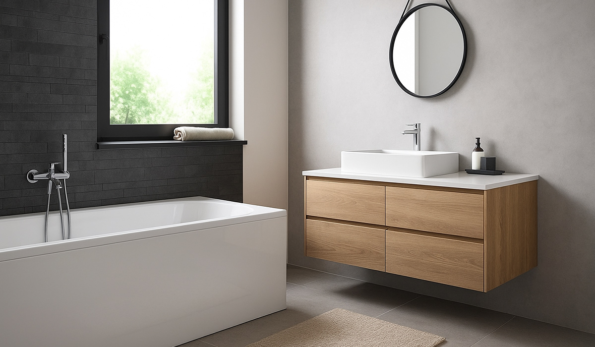 Багато свободи та нічого зайвого – основна концепція стилю контемпорарі для ванної кімнати. Відсутність візуального шуму дозволяє сповна насолодитись приємними щоденними процедурами, що ефективно сприяють відновленню фізичного та емоційного стану. Головним акцентом є функціональність та практичність, тоді як естетичний мінімалізм проявляється у виборі матеріалів та їх фактур. Використання монохромних кольорів виокремлює зони кімнати, чіткі лінії та класичні форми увиразнюють загальну композицію. Сірий керамограніт Stargres Stark Pure Grey Rec 60*60 см на долівці створює спокійний нейтральний фон, на якому дерев’яна тумба чи біла ванна пряма акрилова Koller Pool 120*70 см без ніжок мають елегантний вигляд. Стильний умивальник Jaquar Kerra KR-51 46,5*37,5 см поєднує сучасну форму з традиційною практичністю, що є втіленням новітніх потреб комфорту та естетики. Обравши фарбу гумову універсальну TRIORA 334 RAL 7046 сіру 3,5 кг для оздоблення стіни, можна отримати свіжу палітру відтінків, що досягається завдяки поєднанню природного та штучного освітлення. Хромований змішувач для ванни KFA Armatura Moza Chrome 5039-401-81 з душкомлектом та змішувач для умивальника Ferro Square BAQ2L додають ефектного блиску та стильних візуальних акцентів інтер’єру.