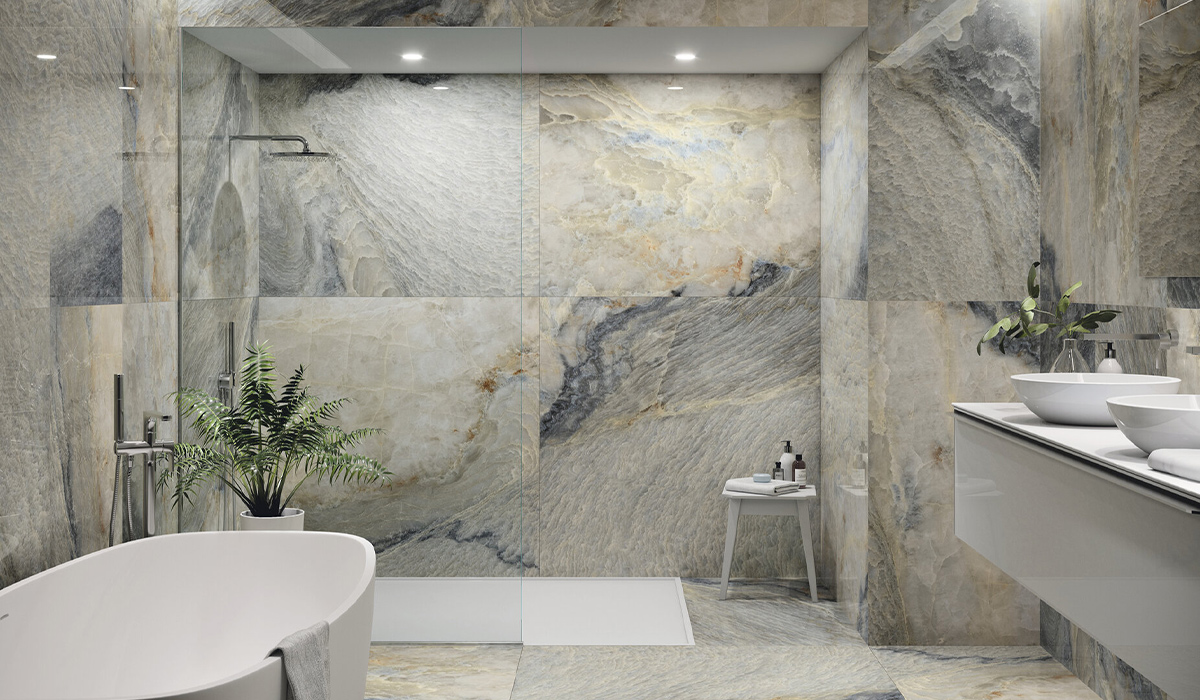 Ванна кімната, оформлена в стилі неокласики, нагадує затишну мушлю з білими перлами на фоні природних композицій кольору і форми. Оригінальна структура керамограніту TEO Ceramics Flint Stone Gold Sugar F PC Rec 60*120 см надає стінам особливого шарму, а розмите поєднання натуральних відтінків заворожує загадковістю і неповторністю. Біла кераміка ванної та умивальників Cerastyle Zero 071600 46 см на такому тлі набуває елегантного вигляду та сліпучої чистоти. Дзеркало Respect-M Thin з підсвіткою 80*60 см відображає чаруючу мармурову поверхню і губиться в її химерних нашаруваннях. В кутку лаконічну композицію складає душова система KFA Armatura Halit 4829-511-00 і утворює просторе і водночас затишне місце для водних процедур. Стелю оздоблюють світильники точкові поворотний Horoz Lavanta 015 024 0050-040 MR16 білі і розсипаються міріадами блискіток по глянцевих поверхнях, наповнюючи простір магією світла. Холодну красу кімнати пом’якшує ніжність і теплота домашнього текстилю, як от рушники махрові Home Line 121748 50*90 білі. Зелень вазонів вдихає свіжість та енергію в розкішну гармонію сучасного інтер’єру.
