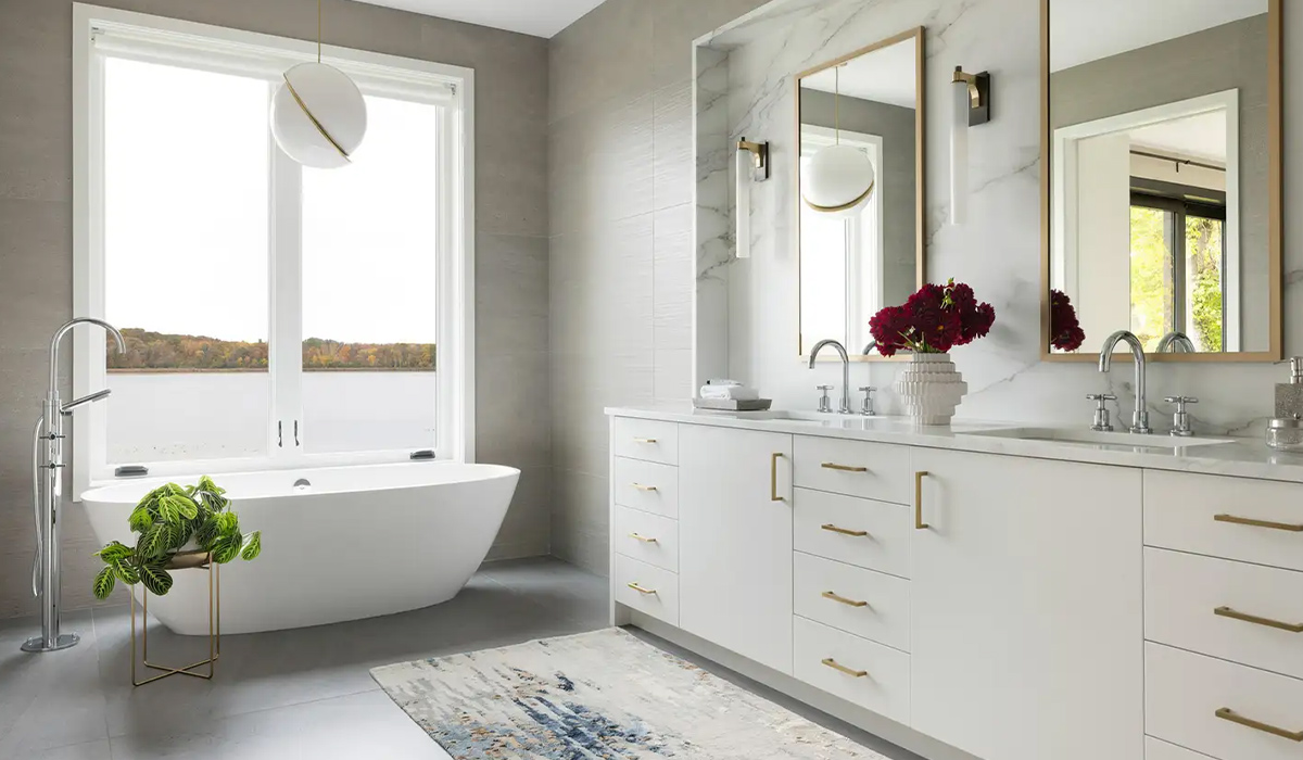 У світлій просторій ванній кімнаті з вікном поєднали благородну сріблястість сірих відтінків та елегантність білого кольору. Природне освітлення додає інтер’єру простору та ошатності, а вишукані деталі створюють особливий атмосферний шарм. Підлога, оздоблена керамогранітом Атем Atlas White NR 30*60 см світло-сірим, випромінює досконалу гладкість, на якій ефектно виглядає м’який ворсистий килим. Продумана композиція стін поєднує монохромність срібного керамограніту TEO Ceramics Leon Silver Mat F P Rec 60*120 см та мармурову розкіш керамограніту Golden Tile Terragres Calacatta Extra Н90580 60*60 см з білою матовою поверхнею. На ній чіткі геометричні лінії малюють два дзеркала Респект-М Style stm-60, що виокремлюють зони для вмивання для двох осіб. Біла стільниця, стильні умивальники, елегантні змішувачі, дозатор для мила AWD Pledo 02191610 та яскравий букет у вазі складають дизайнерський пазл, що зробить ранкові чи вечірні гігієнічні процедури особливо приємними. Вікно можна легко затінити ролетою Деко-Сіті Міні Кульбаба 37923090170 90*170 см під час купання, або ж насолоджуватись краєвидом за вікном, відпочиваючи тілом і душею.