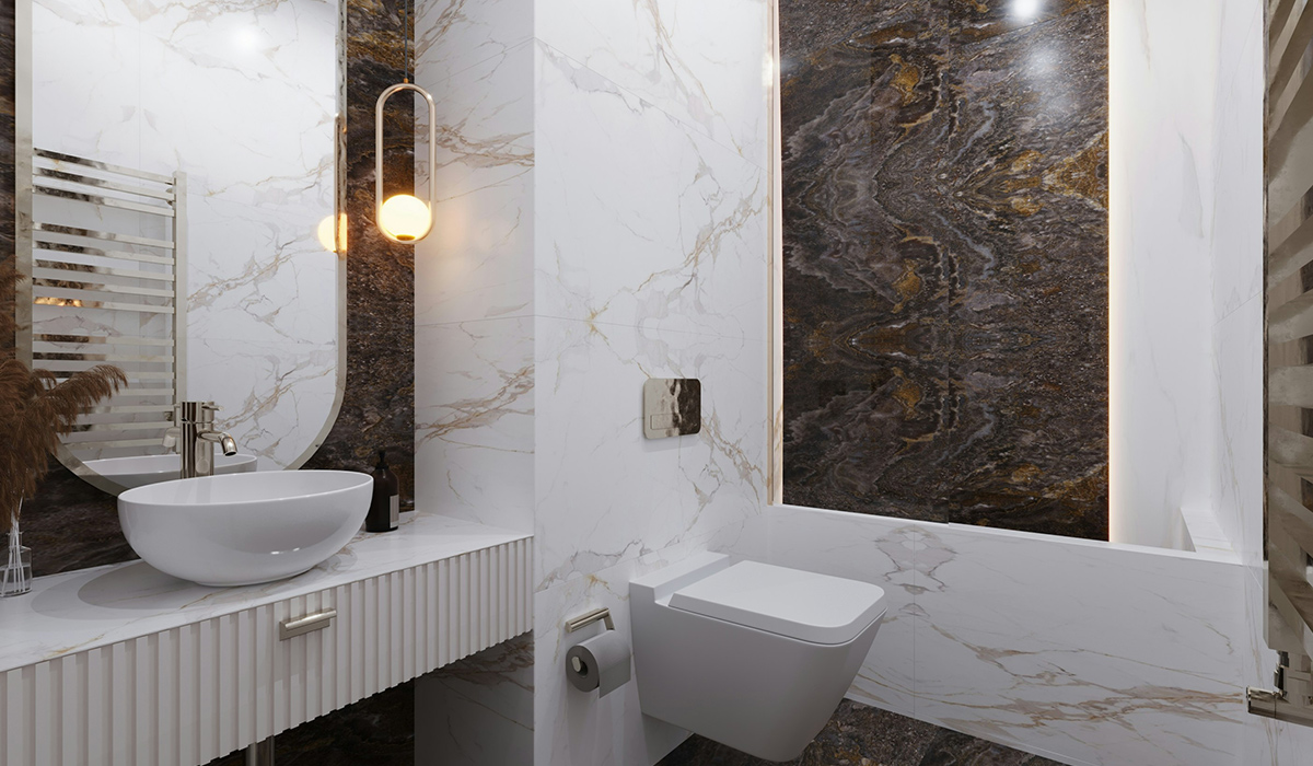 Різноманітність сучасних матеріалів оздоблення поверхонь дозволяє створювати оригінальні рішення для інтер'єрів ванних кімнат та неповторні композиції, що підкреслюють смаки та вподобання їх власників. На фото зображена елегантна ванна кімната, де створена гармонія вишуканості завдяки поєднанню керамограніту Атем Calacatta Gold WM 60*120 см білого та керамограніту TEO Ceramics Snake Stone Bronze Sugar F PC Rec 60*120 см бронзового на стінах. Біла мармурова поверхня вигідно контрастує з химерними розводами темного, створюючи естетичний ефект вишуканості та розкоші. Форма дзеркала Арена Loft 4 з підсвіткою 90*50 см додає плавних ліній інтер’єру, пом’якшує його та збільшує простір. Стильний умивальник овальний Jaquar SOLO SLS-WHT-6901 36,5*49,5 см підкреслює витонченість дизайну оригінальною формою та високою якістю. Праворуч розміщений унітаз підвісний Geberit Modo 502.827.00.1 Rimfree з сидінням, що традиційно демонструє швейцарську майстерність та технологічні інновації для ще більшого комфорту у повсякденному користуванні. Дизайн хромованої кнопки змиву Armaform Platz Pro Slim 2681-011-001 додає блиску і чарівності інтер’єру, забезпечуючи легке та ретельне змивання. Особливу атмосферу кімнати доповнює люстра ALFA NOVAL M 60698 1PL. Її оригінальна форма підкреслює сучасний стиль, а м’яке тепле світло збагачує колірну палітру керамограніту на стінах. Невеликий, але ефектний декор на стільниці біля умивальника додає завершеності та індивідуальності простору.