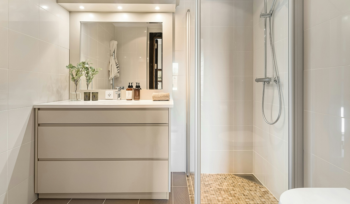 Вдалим сучасним рішенням для невеликої ванної кімнати може стати вибір світлих відтінків в оздобленні та вертикальне використання простору. На фото зображено інтер’єр, в якому глянцеві поверхні, скло та дзеркало додають глибини, а новітнє обладнання збільшує функціональність приміщення. Поєднання темно-сірого керамограніту Rako CCOL.TAA34007.NE2 Color 07 Dark Grey 30*30 см на підлозі з безшовною сатиновою поверхнею керамограніту TEO Ceramics Snow White F P Satin Rec 30*90 см білого на стінах створює теплу атмосферу кімнати. Тут немає місця для просторої ванни, але душова система Grohe Tempesta Cosmopolitan 250 26689001 хром дозволить насолодитися водними процедурами та отримати щедру порцію енергії та позитиву. Вона відокремлена боковою стінкою Aquaform Elbe 113-09325 80*190 см та вистелена матовою мозаїкою Intercerama Tuff М02023 29,8*29,8 см мікс, що запобігає ковзанню. Зручний комод, велике дзеркало Respect-M Style Stm-40 та просторий умивальник створюють ідеальну зону для гігієнічних процедур з базовими зручностями. Важливими деталями є мийні засоби у стильних пляшечках, декоративні свічки та рослинна композиція у вазі, що додають індивідуальності й затишку кімнаті.
