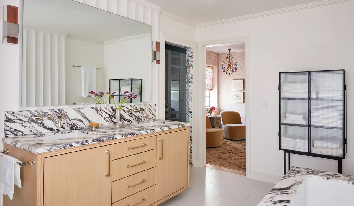 Впорядкована класична ванна кімната виглядає гармонійно й ошатно, забезпечуючи комфортний простір для приємних ранкових чи вечірніх гігієнічних процедур. Біла підлога, вистелена керамогранітом TEO Ceramics Snow White F P Satin Rec 30*90 см, світиться чистотою і спокоєм. Два акуратні умивальники Jaquar Continental CNS-WHT-701 48*36,5 см губляться в строкатому мерехтінні чорно-білого оздоблення стільниці, над якою розміщене просторе дзеркало Respect-M Thin з підсвіткою 80*60 см. Навпроти бачимо ванну пряму акрилову Koller Pool Grace 170*75 см з ефектним оздобленням по контуру. М’які рушники махрові Home Line 177349 450 г/м2 70*140 см білі мають комфортне місце для зберігання у вигляді прозорої шафки в елегантному чорному обрамленні. Чарівна ваза Mazhura Floral mzD007 14*39 см з каллами вносить яскраву свіжість у меланхолійний настрій кімнати.