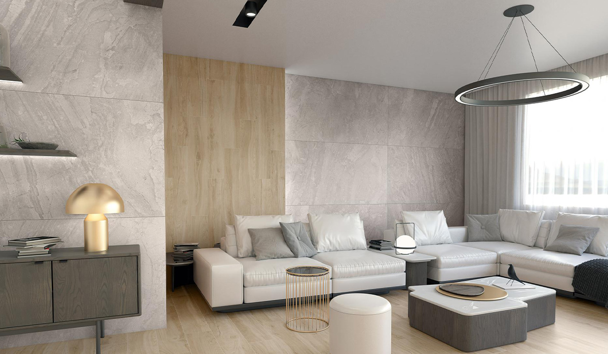 Сучасний стиль вітальні поєднує простору зону відпочинку та елегантний дизайн з футуристичними елементами. Баланс тепла і прохолоди демонструє керамограніт Golden Tile Terragres Alpina Wood 891920 15*60 см бежевий на підлозі та керамограніт Cersanit Locarno Light grey Mat 59,8*119,8 см світло-сірий на стінах. Комфортні дивани дають можливість розмістити велику родину чи компанію друзів, а подушки декоративні Decorator B 237 45*45 см сірі додають тепла і затишку. Космічну композицію світла на стелі утворює люстра світлодіодна Esllse Stella 921070 R APP 96 Вт сіра/біла разом зі світильниками трековими Feron AL100 12W чорними. Столик журнальний Signal Clark золотий є практичним рішенням, оскільки його легко розмістити в будь-якому місці вітальні, скрізь він буде доречним та зручним. Приховані підсвітки додають особливої атмосфери й створюють ілюзію нереальності простору.