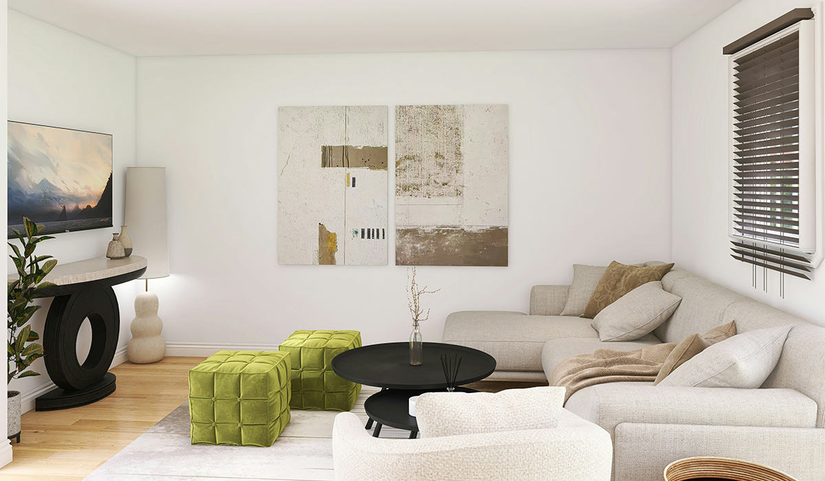 Сучасна вітальня поєднує комфортний простір для відпочинку та яскраві деталі модерної естетики. Світлі відтінки інтер’єру традиційно створюють затишок і спокій домашньої атмосфери. Підлога, вистелена ламінатом Kronospan Castello K470 Дуб кашемір натуральний 32 клас 8 мм, створює теплу основу для природних кольорів та різноманітності структур. Чисті простори стін акуратно оздоблює інтер'єрна фарба акрилова Ceresit IN 53 Lux база А 5 л. Домінантою кімнати є диван кутовий Неаполь бежевий зі зручною подушкою декоративною синтепоновою П05 Гелардо 3 40*40 см. М’який плед Lanavitta Преміум 22074000 140*200 см айворі є відмінним практичним рішенням для холодних зимових вечорів та елегантним доповненням дизайну вітальні. Біле крісло Nobile Barrel Antology 1 ефектно контрастує з чорним комплектом журнальних столиків Signal Atlanta D II. Яскраві фісташкові пуфи та кімнатні рослини вносять жваві акценти в загальну композицію простору, урізноманітнюючи стриманий настрій вітальні.