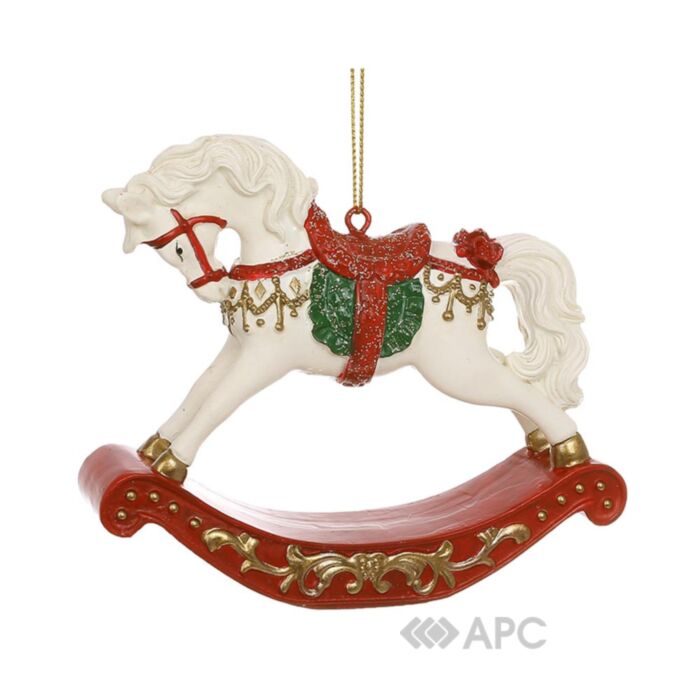 Прикраса виконана у формі конячки-гойдалки і виготовлена з міцного матеріалу — полістоуна. Вона має елегантне поєднання кольорів: основний білий гармонійно доповнений насиченим червоним, яке використовується для гриви, хвоста, полозів гойдалки та зеленим сідлом, надаючи виробу розкішного блиску. Підвіска оснащена золотистим шнурком для зручного кріплення на ялинку. Загальні розміри виробу становлять 11.5*2.5*9.5 см.