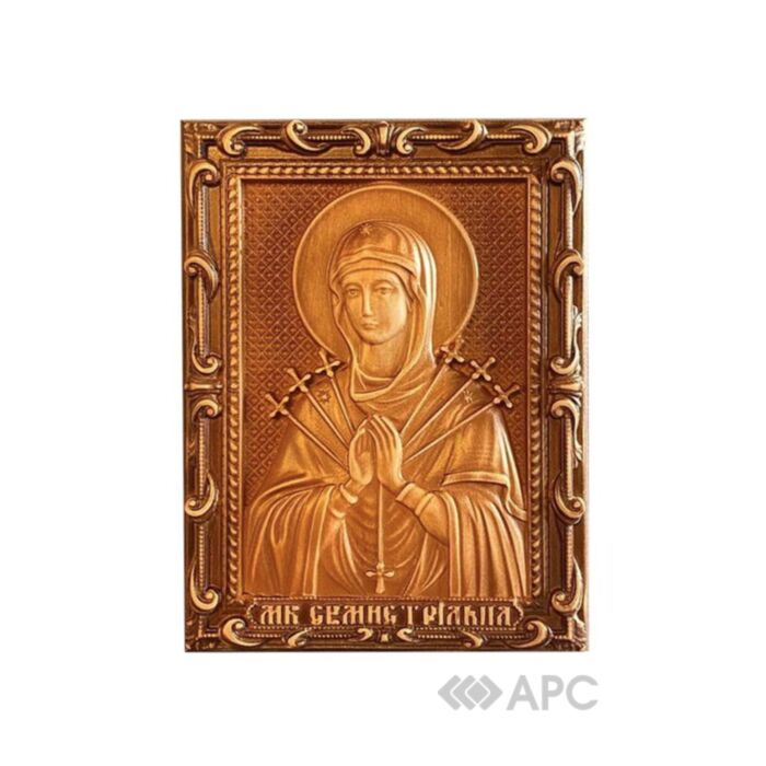 Ікона Матір Божа Семистрільна - це виразне символічне зображення, вирізьблене з дерева, що має глибоке духовне значення. На ній зображено Пресвяту Діву з сімома стрілами, символізуючих сім смертних гріхів, що турбують Богородицю, яка є Заступницею людей. Ця ікона відіграє важливу роль в житті вірян, особливо у моменти негараздів, конфліктів або ворожнечі. Вона є символом надії, захисту і молитви до Богородиці за мир та гармонію і відображає віру та духовні цінності, допомагаючи знайти внутрішню силу та спокій у складних життєвих обставинах.