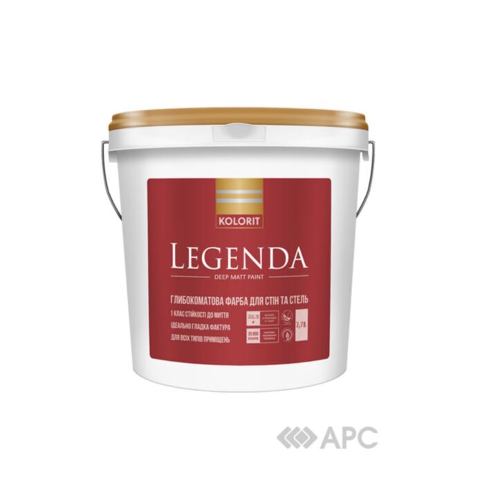 Фарба Kolorit Legenda (база А) - повністю матова, стійка до миття латексна фарба для внутрішніх робіт, на акрилатній основі. Призначена для фарбування обштукатурених, бетонних, цегляних та інших мінеральних поверхонь, а також гіпсокартонних, деревоволокнистих, деревостружкових плит і поверхонь, раніше пофарбованих водно-дисперсійною фарбою. Рекомендується для первинного та ремонтного фарбування стін і стель у вітальнях, спальнях, дитячих кімнатах, кухні, ванній (за виключенням місць прямого попадання води) та ін. житлових приміщеннях, а також в приміщеннях з високим експлуатаційним навантаженням (наприклад, дитячі садки, навчальні заклади, готельні, офісні приміщення, магазини і т.п.). База А - біла, колорується тільки в світлі і пастельні кольори. Фарбу можна наносити валиком, пензлем або розпиленням. При розпиленні під високим тиском застосовувати сопло 0,018" - 0,023". Час висихання при +23 ºС і відносній вологості 50% від пилу – 30 хвилин. Наступний шар можна наносити через 1-2 години. Час висихання збільшується зі зниженням температури і підвищенням відносної вологості повітря. Максимальна міцність покриттям досягається через 28 днів. Готове покриття витримує дію температур від -40 ºС до +80 ºС. Купити інтер'єрну фарбу акрилатну Kolorit Legenda А білу можна в інтернет магазині АРС. У нас завжди актуальна і доступна ціна. Доставка проводиться по Україні - Київ, Харків, Львів та ін.
