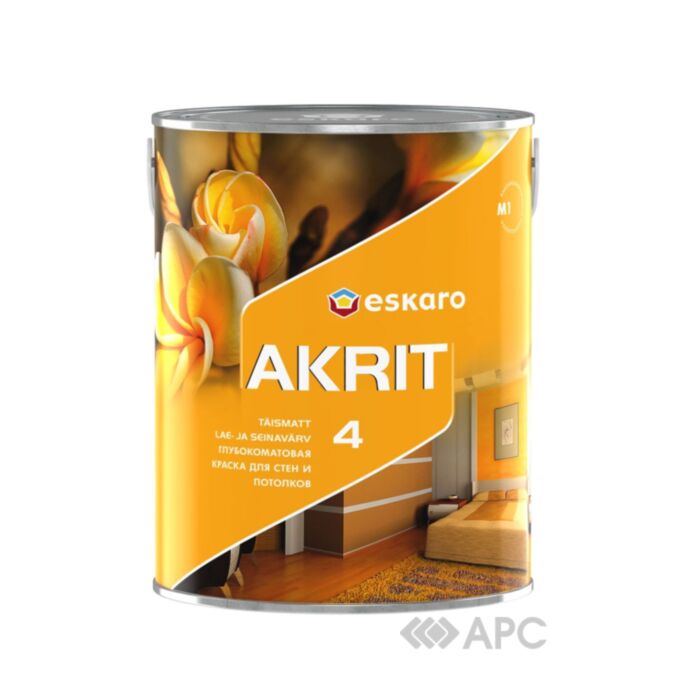 Фарба Eskaro Akrit-4 застосовується для фарбування стін і стель всередині приміщень по новим або раніше забарвленим латексними або алкідними фарбами поверхням з бетону, газобетону, гіпсокартонних плит, ДСП, ДВП, по цегляних, зашпакльованих, оштукатурених поверхнях, а також по поверхнях, що обклеєні рулонними оздоблювальними матеріалами. Рекомендується для використання в приміщеннях з нормальним експлуатаційним навантаженням: спальні, житлові кімнати, офісні приміщення та інше. Фарба витримує легке вологе прибирання. Перед застосуванням Фарба Eskaro Akrit 4 ретельно перемішати. Для нанесення першого шару фарбу можна розбавити водою до 5% за обсягом. Наносити в 2 шари валиком або розпилювачем при температурі 10 °С-25 °С і відносній вологості не більше 80%. При фарбувальних роботах, що проводяться в несприятливих умовах (протяги, використання нагрівальних приладів, висока температура або низька вологість повітря) рекомендуємо використовувати засіб для уповільнення висихання Time +. Витрата: 6-10 м2 / л. Купити фарбу акрилову Eskaro Akrit-4 напівматову білу можна в інтернет магазині АРС. У нас завжди актуальна і доступна ціна. Доставка здійснюється по Україні - Київ, Харків, Львів та ін.