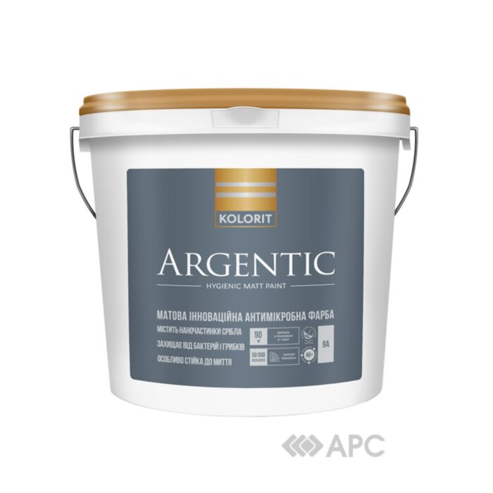 Фарба антимікробна Kolorit Argentic база А – чудовий варіант для використання в приміщеннях, до яких висуваються підвищені вимоги безпечності та гігієнічності. Основою для фарби стала водна дисперсія акрилатного сополімеру з додаванням мінеральних наповнювачів, пігментів, функціональних добавок та бактерицидном на основі срібла. Антимікробна дія підтверджена відповідно до стандарту ISO 2219. З Kolorit Argentic можна бути спокійними за стіни та стелі у дитячих кімнатах, лікарнях та приміщеннях, пов’язаних із харчуванням. 99% патогенних мікроорганізмів знищуються на поверхні, завдяки системі Argentum Protect.