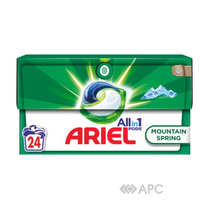 Капсули для прання Ariel Гірське джерело 24*19,5 г це найзручніший формат продукту, що допоможе зробити улюблені речі чистими. Інноваційна формула дозволяє складу глибоко проникати в тканини та видаляти забруднення, не руйнуючи волокна та зберігаючи колір. Неймовірна м’якість, свіжий аромат залишаться із вами надовго. Зручний формат капсул дозволяє очистити більшу кількість речей за один раз, тож упаковки вистачить на достатню кількість циклів прання.