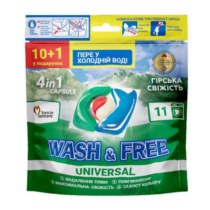 Капсули для прання Wash&Free Гірська свіжість— це універсальна продукція, яка має чотирикомпонентну дію, що допомагає ефективно видаляти будь-які плями. Основна властивість - це потужне очищення, пом’якшення, свіжість та захист кольору. Даний засіб відмінно проникає у волокна, видаляє навіть найсильніші забруднення. Підходить для усіх типів тканин, крім шовку і вовни. Забезпечують одягу м’якість, нейтралізують неприємні запахи, захищають від втрати кольору. Повністю розчиняються у воді, цим самим забезпечують високу ефективність очищення. Упакування налічує 11 штук.
