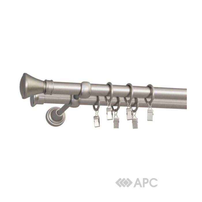 Практичний та делікатний подвійний карниз Bojanek кольору сатин нікель ідеально підійде для кріплення легких, середньої важкості та важких штор, тюлю, гардин. Трубчастий настінний карниз виготовляється з високоякісної сталі, легко кріпиться за допомогою монтажних шурупів і дюбелів, характеризується стійкістю до механічних пошкоджень, надійністю та довговічністю. В комплект входять 2 карнизи довжиною 2 м (діаметр — 19 мм), тримачі, кільця з прищіпками-жабками.