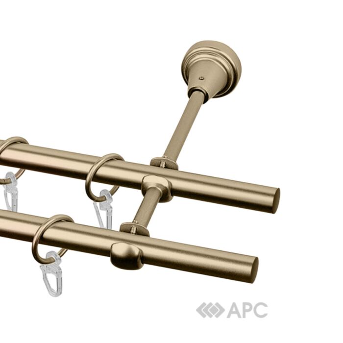 Практичний та делікатний подвійний карниз Cardinal кольору античного золота ідеально підійде для кріплення легких, середньої важкості та важких штор, тюлю, гардин. Трубчастий настінний карниз виготовляється з високоякісної сталі, легко кріпиться за допомогою монтажних шурупів і дюбелів, характеризується стійкістю до механічних пошкоджень, надійністю та довговічністю. В комплект входять 2 карнизи довжиною 2 м (діаметр — 16 та 25 мм), тримачі, кільця з гачком.