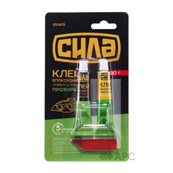 Клей на основі епоксидної смоли – швидкодіюча речовина для універсального використання. Клей застигає протягом 5 хв, після чого створюється надійне з'єднання, стійке до вливу вібрацій, вологи, температур. Допоможе склеїти скло, кераміку, метал, водопровідні труби, шкіру, пластик, мармур та інші матеріали. Є стійким до бензину, антифризу та більшості розчинників.