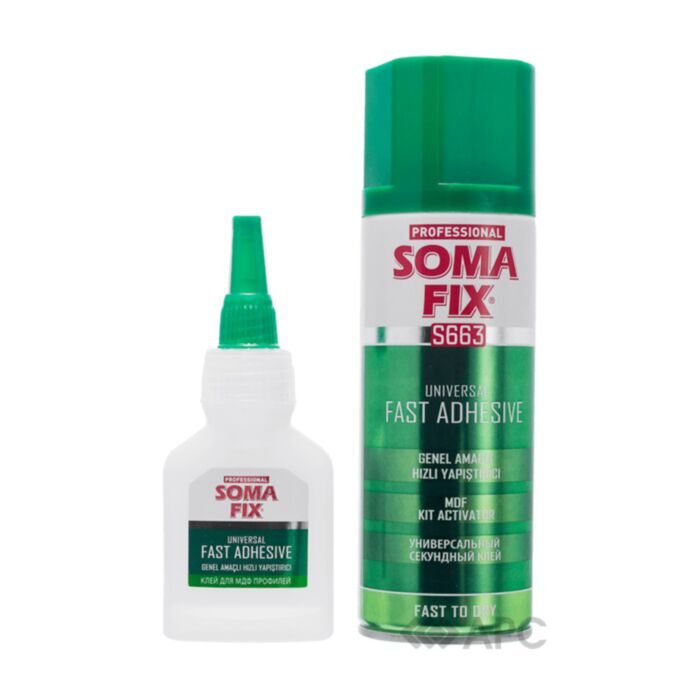 Клей Soma Fix 0621 50 г активатор швидкого склеювання S663 200 мл — засіб для швидкої та надійної фіксації поверхонь. Володіє коротким терміном засихання (5-10 секунд) та високою зносостійкістю. Продукт випускається у прозорому вигляді, тому не зіпсує зовнішнього вигляду площин. Випускається без токсичних речовин у складі, проте радимо тримати у недоступному для дітей місці.
