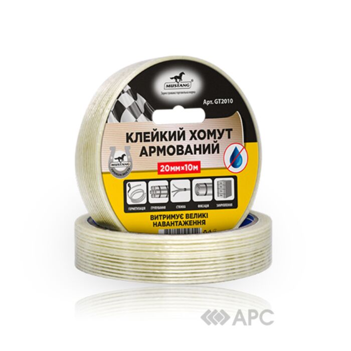 Клейкий хомут армований Mustang GT2010 20 мм 10 м використовується у вигляді клейкої стяжки понад важких вантажів, тросів, кабелів, кріплення піддонів, а також для заміни хомутів, ПП ПЕТ стреппинг-стрічок і дроті. Стрічка має високу утримувальну здатність, волого - паронепроникні властивості. Чудова річ у процесі виконання ремонтних робіт.