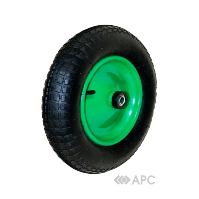 Колесо для тачки на кульковому підшипнику витримує значні навантаження. Розмір осі становить 20*130 мм. Рифлений протектор забезпечує щільне зчеплення з землею, що є незаперечною перевагою на будь-якому будівельному майданчику, а також в господарстві: для садових і аграрних робіт. Колесо з пневматичною камерою і автомобільним ніпелем дуже легко обслуговувати і підкачати при необхідності.