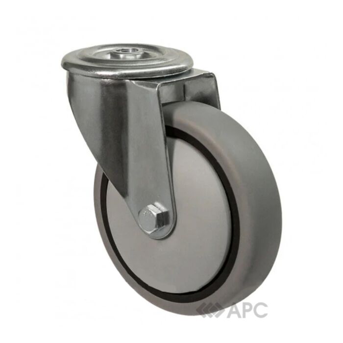 Колесо для візка Kastor 2405-N-125-R 245125 125 мм виконане з поліпропілену та контактного шару з термопластичної гуми. У конструкцію виробу входять захисні пластикові ковпаки та прихований пильовик, завдяки чому вісь колеса та його поворотний механізм максимально захищені від потрапляння пилу та бруду. Виріб завдяки своїм високим показникам гігієнічності та можливості легкої санітарної обробки входить до комплектації різноманітних медичних та фармацевтичних колясок, а також використовується у промислових цехах та супермаркетах. Колеса відрізняються низьким опором коченню і можуть експлуатуватися за умов швидкості пересування до 4 км/год як усередині, так і зовні будівлі.