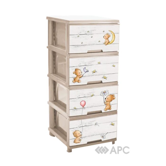 Декоративний збірний комод - чудове рішення для розумної організації вільного простору в дитячій кімнаті, передпокої, кладовці та ін. 4 ящики легко вміщують іграшки, речі побутового користування, дрібні деталі та негабаритні інструменти. Пластиковий комод стійкий до впливу вологи, що дозволяє розташовувати виріб у ванній кімнаті. Різноплановий декор доступний у понад 10-ти дизайнах, тому підійде до будь-якого стилю приміщення.