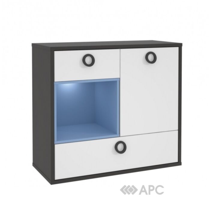 Комод COLORS виконаний в колірній комбінації: Uni Wolfram Grey (корпус) і білий. Відмітним акцентом є асиметрична синя перетинка, що нагадує стилістику інших меблів з колекції COLORS.
