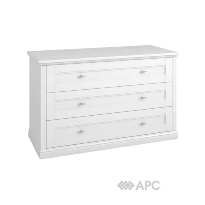 Комод Merx Virginia ВЖ300 білий - це стильний та функціональний елемент інтер'єру спальні. Завдяки трьом висувним шухлядам він надасть вам достатньо місця для зберігання одягу та аксесуарів.Виготовлений з МДФ, та має фарбований фасад, який додає вишуканості простору. Висувні шухляди виготовлені з ДСП товщиною 16 мм та забезпечують міцність конструкції.
