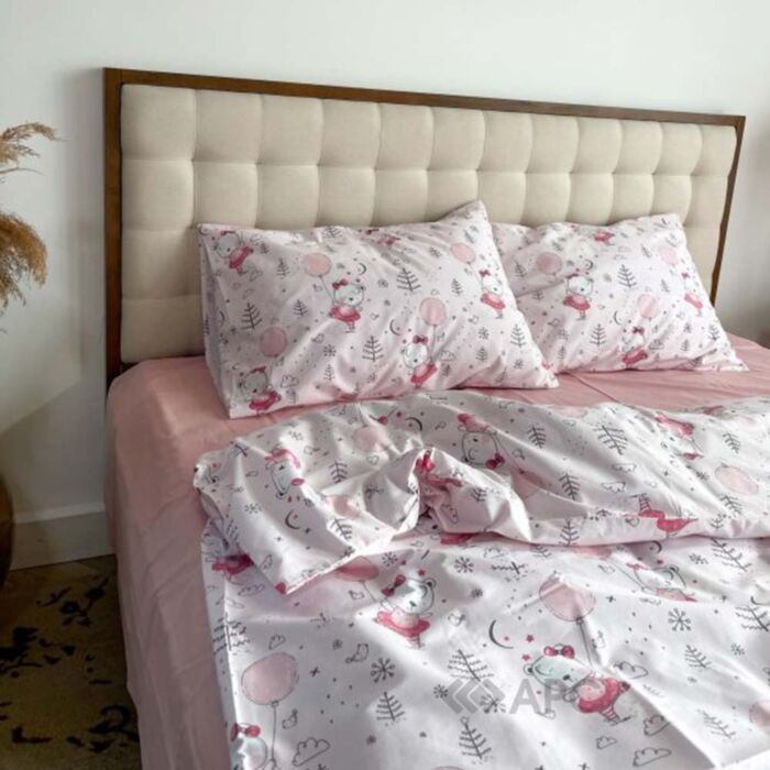 Комплект постільної білизни Na Khmari Snowberears Pink – це півтораспальний набір, виготовлений зі 100% бавовни (поплін) щільністю 140 г/м². Тканина відрізняється приємними тактильними властивостями, відсутністю блиску, вишуканими мінімалістичними малюнками та не потребує прасування після прання. Щільність тканини вище середньої, що забезпечує її міцність та довговічність.