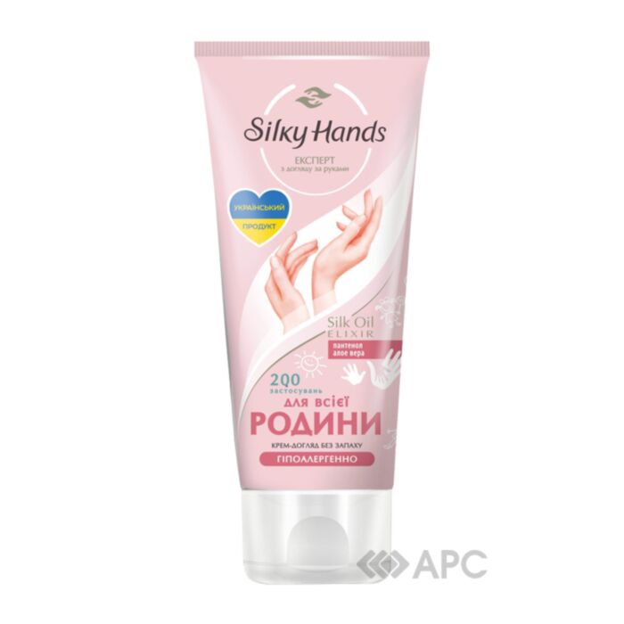 Крем для рук Silky Hands для всієї родини 200 мл – це універсальний засіб, розроблений для комплексного догляду за шкірою рук для всіх членів сім'ї, включаючи дітей віком від 4 років. Його гіпоалергенна формула, що не містить ароматизаторів та барвників, у поєднанні з легкою консистенцією, забезпечує швидке вбирання без відчуття липкості, що підтверджено клінічними дослідженнями. Активні компоненти, такі як алое вера та провітамін В5 (пантенол), забезпечують інтенсивне зволоження та сприяють ранозагоювальній дії, запобігаючи зневодненню. Гліцерин пом'якшує шкіру та підтримує здоровий гідроліпідний баланс, тоді як алантоїн надає ультракомфортне пом'якшення. Олія авокадо живить покрив, захищає його від сухості та появи зморшок, відновлює імунітет та стимулює синтез власного колагену. Вітамін Е забезпечує потужну антиоксидантну дію, а спеціальний комплекс із шовкових протеїнів та мікроолій Silk Oil Elixir робить шкіру надзвичайно ніжною та гладенькою.