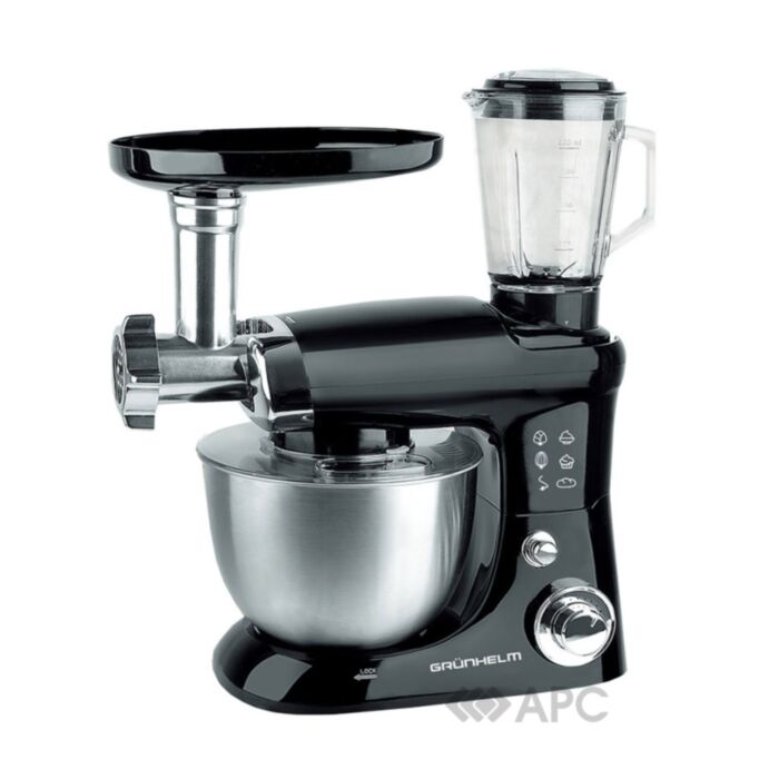 Кухонний комбайн Grunhelm GKM0016B 1200-1500 Вт – це функціональний прилад для виконання багатьох кулінарних завдань. Його комплектація включає містку чашу об'ємом 6 літрів, виготовлену з нержавіючої сталі. Для замішування тіста різної консистенції передбачено кілька насадок, зокрема гак для тіста, віночок для збивання та плоский бітер для перемішування. Модель також оснащена м'ясорубкою з набором насадок для приготування фаршу різного ступеня помелу та ковбас. Блендер зі скляною чашею дозволяє готувати смузі, коктейлі, супи-пюре та інші напої. Для шаткування та нарізання овочів передбачені відповідні диски-насадки. Працює в 6 режимах швидкості. Завдяки своїй потужності та різноманіттю функцій, цей кухонний комбайн стане незамінним помічником на кухні.