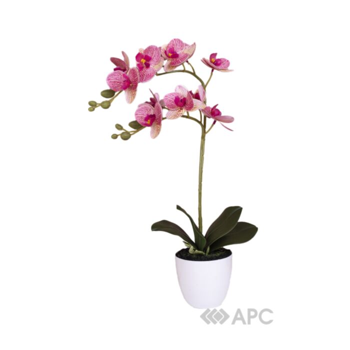 Штучна орхідея в горщику Decorize 2018-2 - це стильний акцент для вашого інтер'єру. Ця прекрасна рослина має висоту 44 см, виготовляється з високоякісного латексу, що надає їй натуральний вигляд. Квітка доступна у двох кольорах: фіолетовому і рожевому, що дозволяє підібрати той варіант, який найкраще личитиме до вашого стилю.