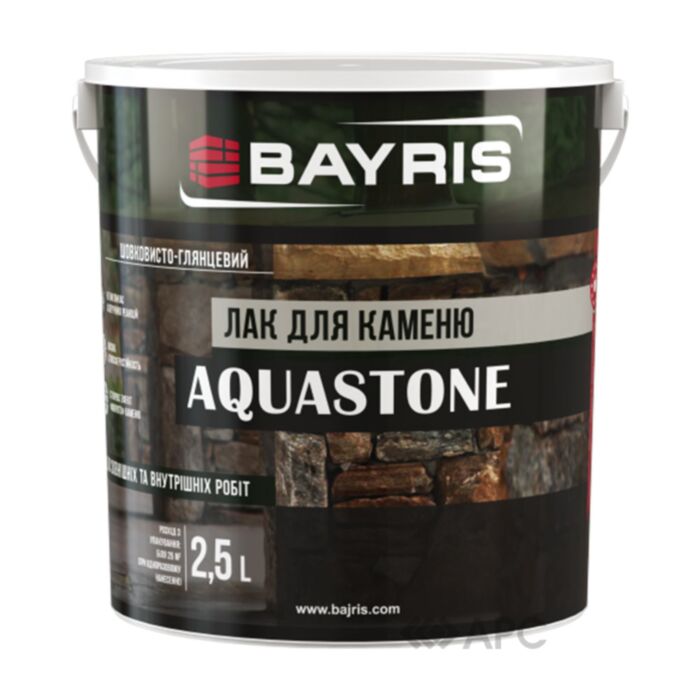 Лак для каменю Bayris Aquastone 0,75 л використовується для захисту від ультрафіолетового випромінювання, руйнування, вивітрювання та надання ефекту мокрого каменю мінеральним поверхням. Засіб характеризується високими показниками адгезії до основ та глибоким проникненням, не виділяє неприємного запаху та токсичних речовин. Екологічність продукту підтверджена вимогами міжнародних стандартів. Компанія Bayris на основі якісної сировини, і інноваційних технологій та великого досвіду створила лак нового покоління, який після висихання утворює прозору, дихаючу, атмосферостійку та еластичну плівку, яка ефективно відштовхує водне середовище.