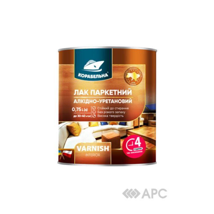 Лак паркетний Корабельна алкідно-уретановий 0,75 л призначений для обробки паркетних, дерев’яних підлог, ДСП, ДВП та ін. Засіб виконує захисно-декоративну функцію, має високу адгезію до поверхні. Готовий до використання лак рівномірно наноситься, утворюючи тверду еластичну глянцеву плівку. Таке покриття має здатність не лише підкреслити природній малюнок дерева, а й вберегти покриття від механічних пошкоджень та передчасного псування. Лак для паркету має високу опірність до стирання та частого впливу миючих засобів.