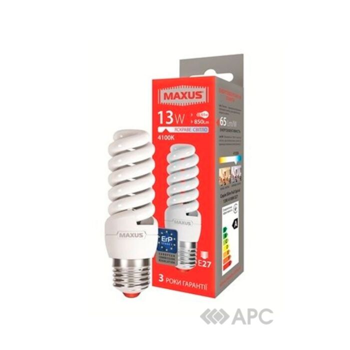 Лампа люмінесцентна Maxus 1-ESL-224 Slim full spiral 13W 4100K E27 - компактний енергозберігаючий виріб, повноцінна заміна лампи розжарювання. Вона має максимально яскравий світловий потік при мінімальному споживанні електрики. Модель використовується для освітлення житлових, виробничих і громадських приміщень.