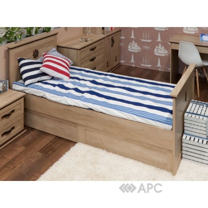 Екологічно чиста ДСП Egger (Австрія), колір дуб Небраска натуральний; ручки з обробкою з натуральної шкіри; аплікації в морській тематиці кольору состаренного золота; фурнітура Blum (Австрія) з газовими доводчиками.