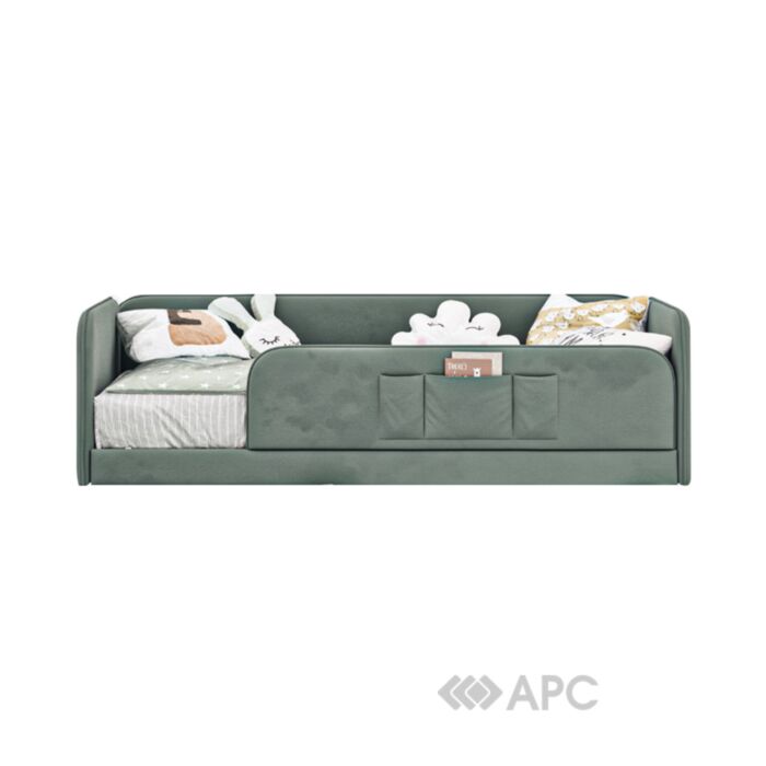 Ліжко Woodsoft Rio з бортиком 90*200 см Cloud 33 зелене поєднує в собі комфорт, функціональність та естетичний дизайн. Міцний каркас ліжка виготовлений з якісної деревини, що забезпечує його міцність та довговічність. Розмір спального місця 90х200 см є стандартним для односпальних ліжок і підходить як для дітей, так і для дорослих. Наявність бортика є важливою особливістю, особливо якщо ліжко призначене для дитини або людини, яка потребує додаткового захисту від падіння під час сну. Бортик забезпечує безпеку та спокійний сон, при необхідності його можна зняти. Лаконічні лінії моделі та зелений відтінок дозволяє виробу легко вписуватися в різні стилі інтер'єру. Світлі бежеві тони створюють відчуття затишку та спокою в кімнаті.