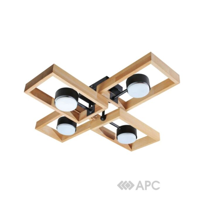 Вона має чорний колір і виконана з контрастних матеріалів: металева основа забезпечує міцність конструкції, а дерев'яний плафон (у вигляді чотирьох квадратних рамок) додає теплоти та сучасності. Люстра не має традиційних ріжків.
