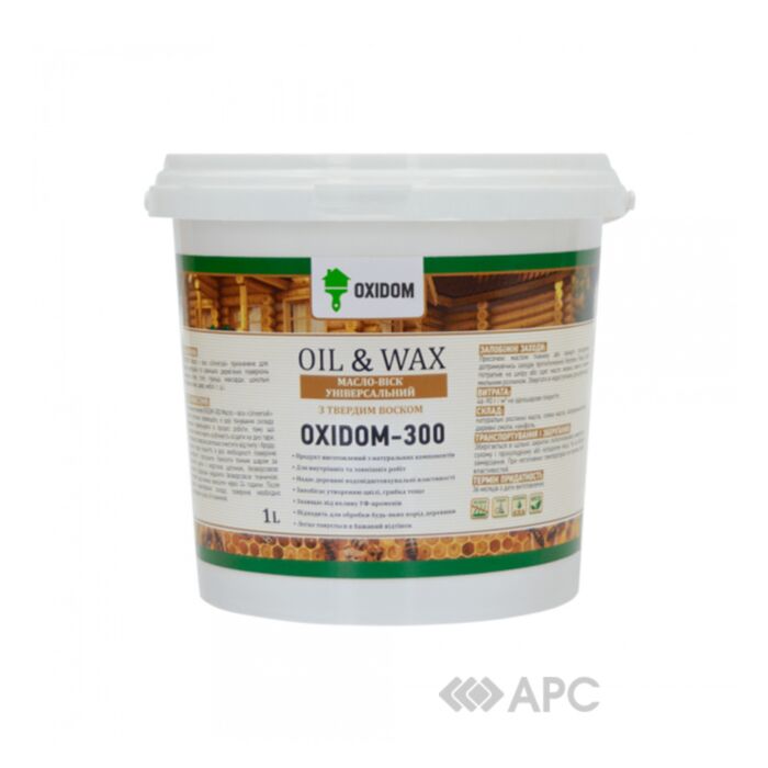 Масло OxiDom 300 з вмістом воску включає до складу натуральні смоли і масла (екологічно чисті), які чудово підходять для обробки дерева. Додають матеріалу водовідштовхувальні властивості, стійкість до зношування, розтріскування, грибків і плісняви. Також є профілактичним засобом проти комах-паразитів. Надає захист від згубного впливу УФ-випромінювання. Застосовується для внутрішніх і зовнішніх робіт: обробки стель, стін, дверей, вікон, підлоги, балок, горищ, елементів покрівлі і т.д. Витрата продукту становить близько 60-100 г/м². Для більш надійного ефекту наноситься в декілька шарів з видаленням надлишків. Повне висихання настає через 24 години. Зовнішніх (останній) шар полірується сухою тканиною.
