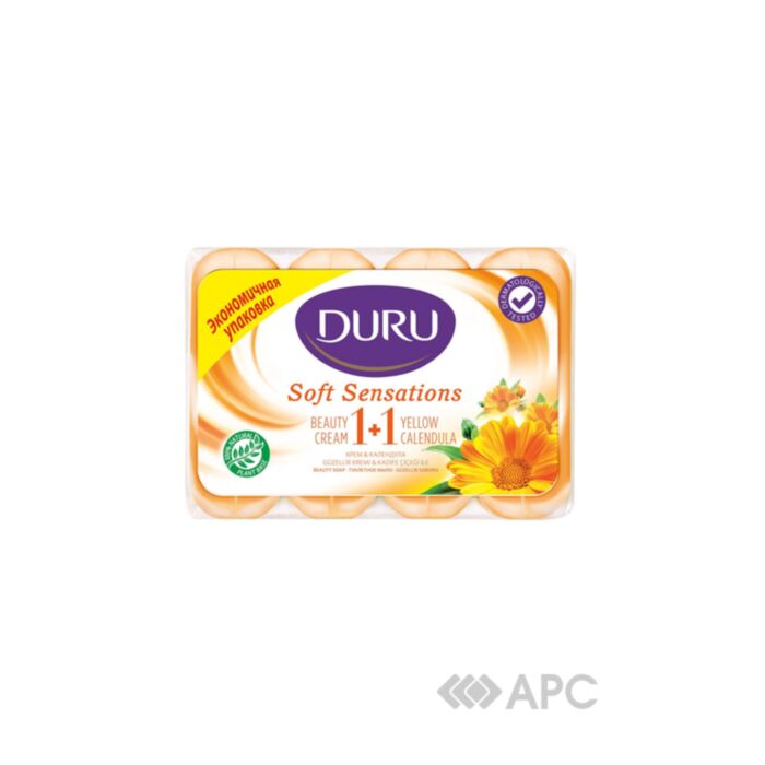Мило Duru 1+1 Soft Sensation — це засіб українського виробництва, який призначений для делікатного очищення шкіри рук, обличчя, тіла. М’яка формула з екстрактом календули та кремом, має ефективну зволожувальну дію, глибоко очищує, живить шкіру корисними компонентами. Завдяки регулярному використанню вона буде ніжною, а також приємною на дотик. Добре піниться, має приємний запах, залишає після себе відчуття чистоти та свіжості. Упакування містить 4 штуки по 90 г кожне, що дуже вигідно.
