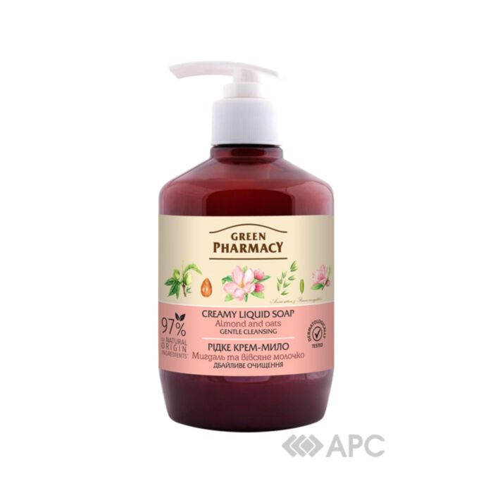 Мило рідке Зелена Аптека — це засіб, який дбайливо очищує та створює повноцінний догляд за шкірою. До складу входить олія мигдалю та екстракт вівса, що мають чудові пом’якшувальні, а також зволожувальні властивості. Засіб захищає від негативного впливу навколишнього середовища. Перевагою виробу є те, що він містить 0% парабенів. Перед застосуванням обов’язково треба перевірити чутливість до окремих компонентів. Об’єм баночки 465 мл.